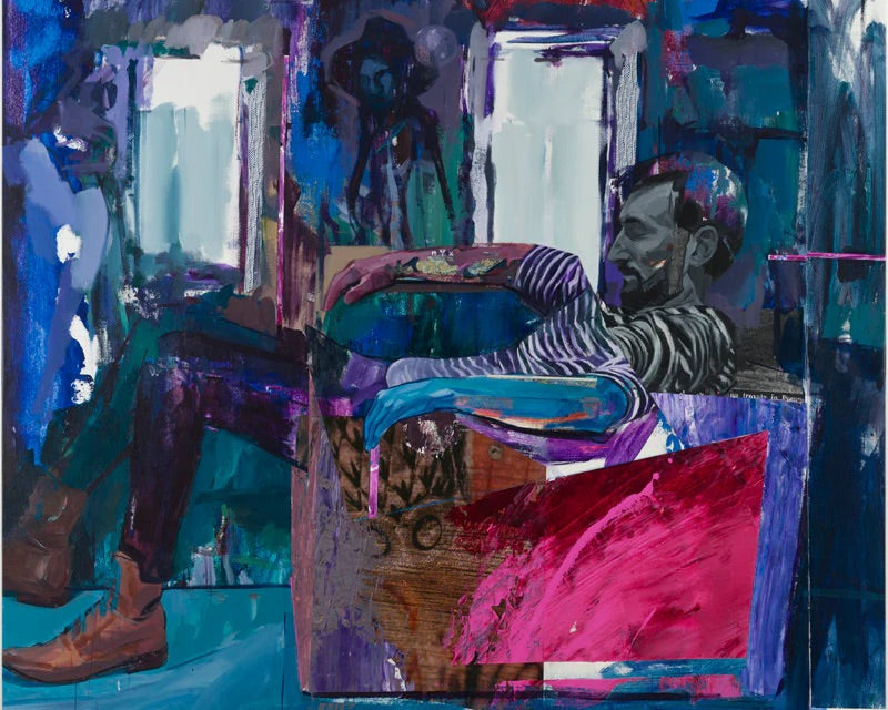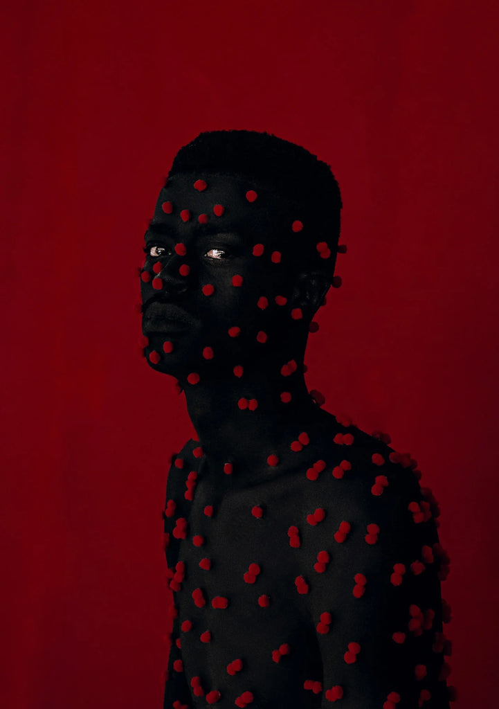 A Black man is shown with red pom-poms, set against a red background. The high contrast of skin tone and color creates a strong visual effect. The artwork raises questions of identity and vulnerability. The simple composition focuses attention on the central figure.