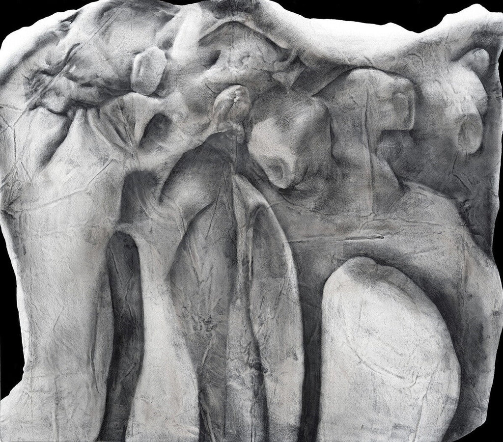 A monochrome relief sculpture presents interconnected human or abstract forms. Light and shadow highlight the stone's texture, enhancing the work's three-dimensionality. The indistinct figures encourage reflection on connection, identity, and humanity. The single color focuses attention on form and texture, inviting an introspective viewing.